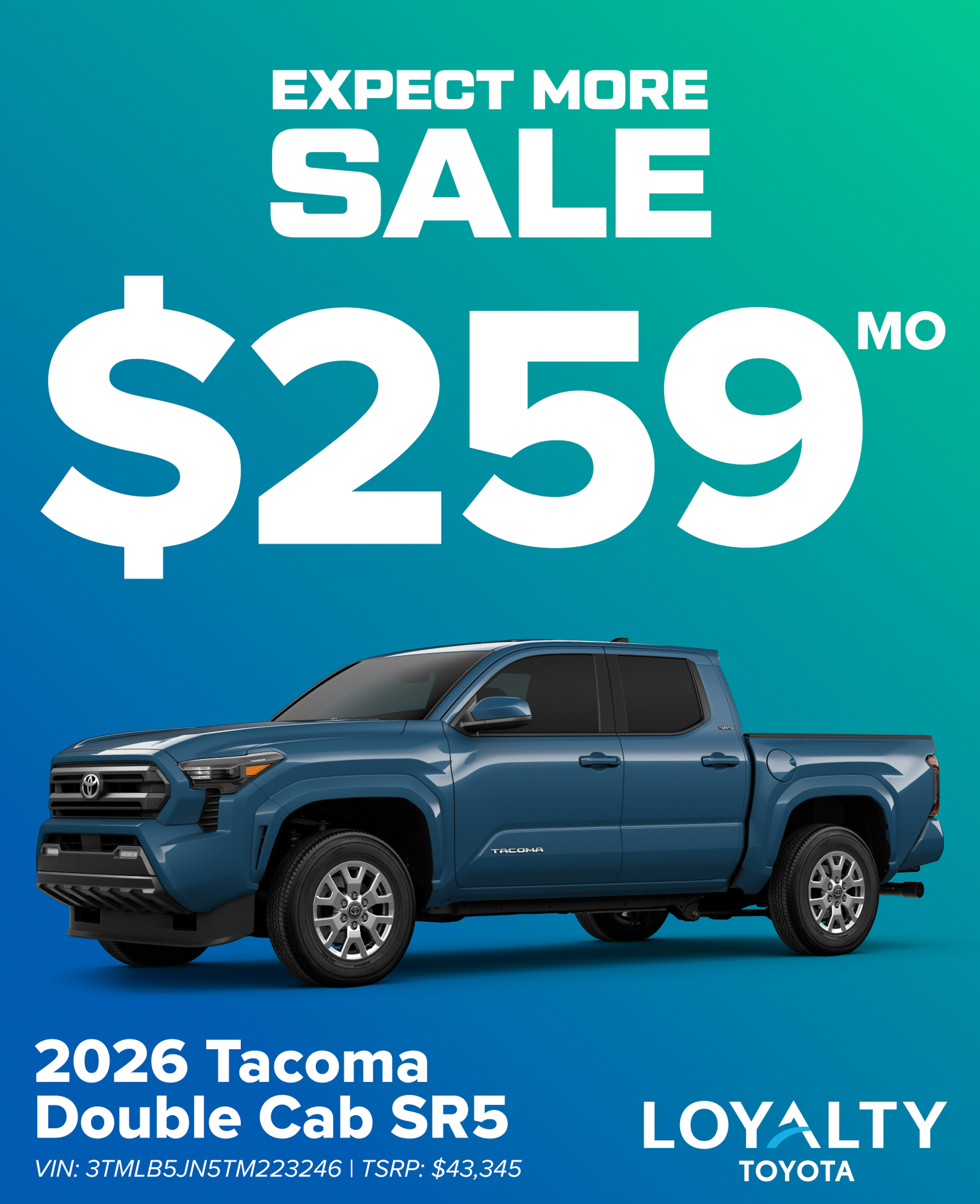 1 OFFER DOES NOT INCLUDE TITLE, TAX, TAGS, SECURITY DEPOSIT, ANY DEALER INSTALLED ACCESSORIES WHERE APPLICABLE, AND $999 PROCESSING FEE. OFFER AVAILABLE ON APPROVED CREDIT THROUGH DEALER SOURCE FOR VERY WELL QUALIFIED CUSTOMERS. LEASE OFFERS FOR 39 MONTHS BASED ON 10,000 MI/YEAR. 2026 TACOMA DOUBLE CAB SR5 4x4 (VIN: 3TMLB5JN5TM223246), TSRP $43,345, $4,999 DUE AT SIGNING. CANNOT BE COMBINED WITH OTHER OFFERS UNLESS SPECIFIED OTHERWISE. SEE DEALER FOR DETAILS. OFFER EXPIRES 3/02/26.