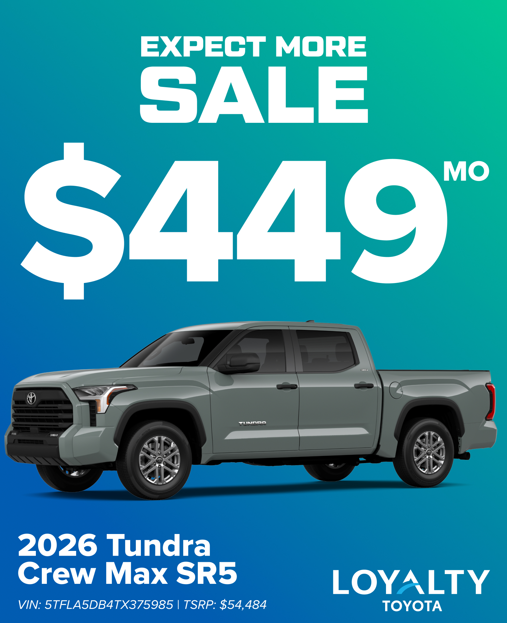 2 OFFER DOES NOT INCLUDE TITLE, TAX, TAGS, SECURITY DEPOSIT, ANY DEALER INSTALLED ACCESSORIES WHERE APPLICABLE, AND $999 PROCESSING FEE. OFFER AVAILABLE ON APPROVED CREDIT THROUGH DEALER SOURCE FOR VERY WELL QUALIFIED CUSTOMERS. LEASE OFFERS FOR 36 MONTHS BASED ON 10,000 MI/YEAR. 2026 TUNDRA CREW MAX SR5 4x4 (VIN: 5TFLA5DB4TX375985), TSRP $54,484, $4,999 DUE AT SIGNING. CANNOT BE COMBINED WITH OTHER OFFERS UNLESS SPECIFIED OTHERWISE. SEE DEALER FOR DETAILS. OFFER EXPIRES 3/02/26.