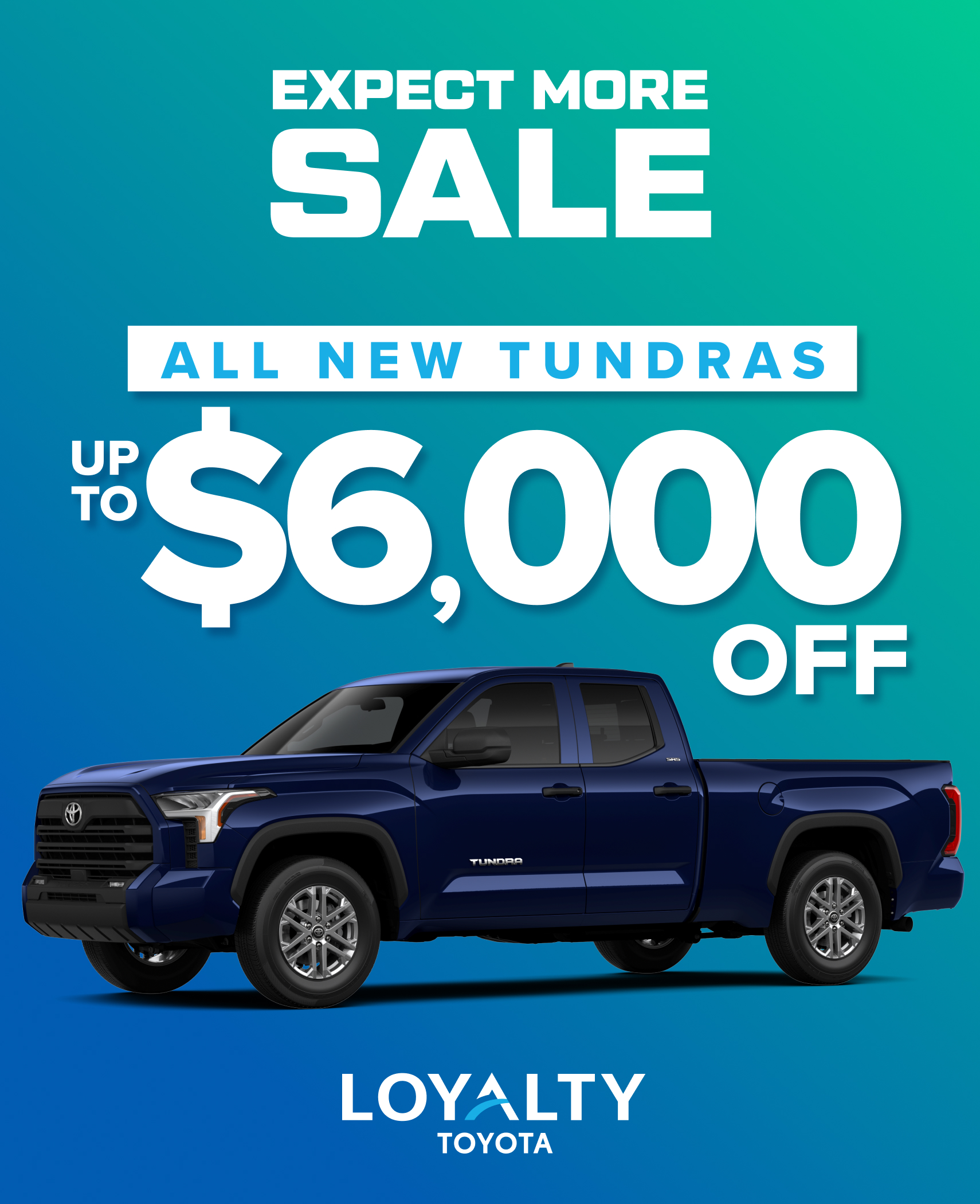 5 OFFER DOES NOT INCLUDE TITLE, TAX, TAGS, SECURITY DEPOSIT, ANY DEALER INSTALLED ACCESSORIES WHERE APPLICABLE, AND $999 PROCESSING FEE. OFFER AVAILABLE ON APPROVED CREDIT THROUGH DEALER SOURCE FOR VERY WELL QUALIFIED CUSTOMERS. UP TO $6,000 OFF 2026 & 2025 TUNDRA (VIN: 5TFJA5DB6TX09A958 TSRP $62,148). ANY DEALER INSTALLED ACCESSORIES AND $999 DEALER PROCESSING FEE. OFFER AVAILABLE ONLY ON NEW VEHICLES WITH AN TSRP UNDER $100,000. OFFER CANNOT BE COMBINED WITH OTHER OFFERS UNLESS SPECIFIED. SEE DEALER FOR DETAILS. OFFER EXPIRES 3/02/26.