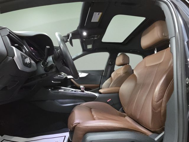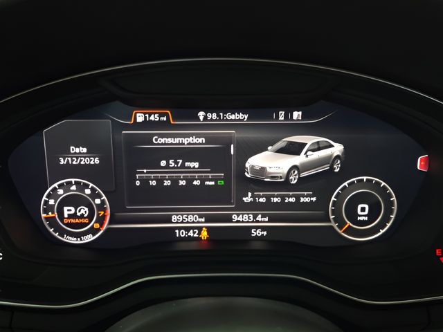 Vehicle Options: 10 Speakers, 4-Wheel Disc Brakes, ABS brakes, Air Conditioning, Alloy wheels, AM/FM radio, Anti-whiplash front head restraints, Audi smartphone interface (Apple CarPlay/Android Auto), Auto-dimming Rear-View mirror, Automatic temperature control, Brake assist, Bumpers: body-color, Compass, Delay-off headlights, Driver door bin, Driver vanity mirror, Dual front impact airbags, Dual front side impact airbags, Electronic Stability Control, Exterior Parking Camera Rear, Four wheel independent suspension, Front anti-roll bar, Front Bucket Seats, Front Center Armrest, Front dual zone A/C, Front fog lights, Front reading lights, Garage door transmitter: HomeLink, Heated 3-Step Front Bucket Seats, Heated front seats, Heated power door mirrors, High intensity discharge headlights: Xenon plus, Illuminated entry, Knee airbag, Leather Seating Surfaces, Leather Shift Knob, Leather steering wheel, Low tire pressure warning, Occupant sensing airbag, Outside temperature display, Overhead airbag, Overhead console, Panic alarm, Passenger door bin, Passenger vanity mirror, Power door mirrors, Power driver seat, Power moonroof, Power passenger seat, Power steering, Power windows, Radio data system, Radio: Audi MMI Navigation Plus w/MMI Touch, Radio: Audi Sound System, Rain sensing wipers, Rear air conditioning, Rear anti-roll bar, Rear fog lights, Rear reading lights, Rear seat center armrest, Rear window defroster, Remote CD player, Remote keyless entry, Speed control, Speed-sensing steering, Speed-Sensitive Wipers, Split folding rear seat, Steering wheel mounted audio controls, Tachometer, Telescoping steering wheel, Tilt steering wheel, Traction control, Trip computer, Turn signal indicator mirrors, Variably intermittent wipers, and Wheels: 7.5" x 17" 5-Spoke-Y Design.